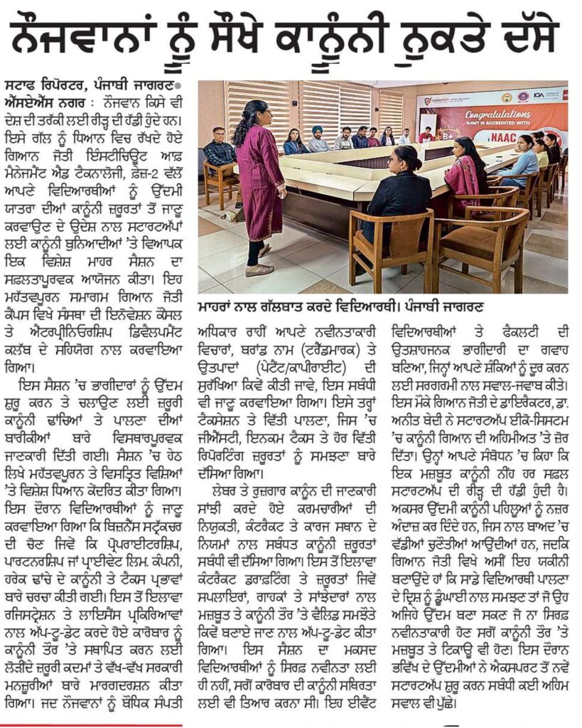 The Institution’s Innovation Council (IIC) and Entrepreneurship Development Club of GJIMT organized an expert session on “Legal Essentials of Entrepreneurs: Startups and Compliance.” The session aimed to enhance participants’ understanding of the legal and regulatory frameworks crucial for establishing and managing startups effectively.